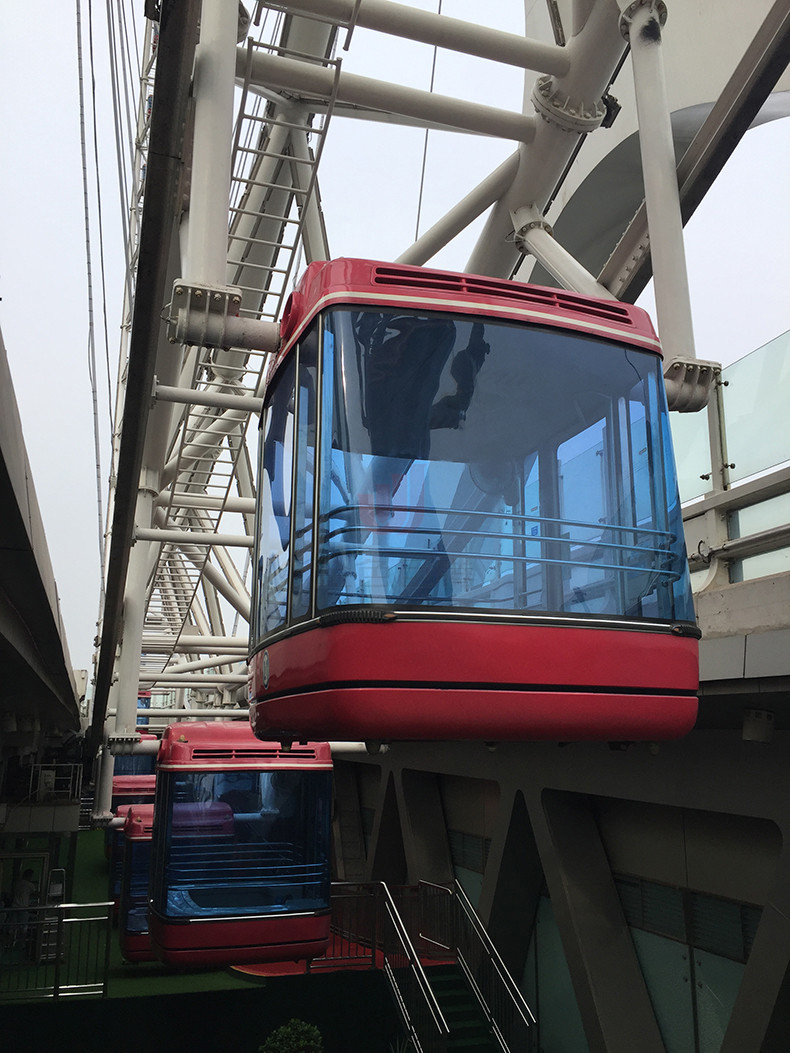 摩天輪直徑為110米,輪外裝掛48個360度透明座艙,每個座艙可乘坐8個人,可同時供384個人觀光。摩天輪旋轉(zhuǎn)一周所需時間為28分鐘,到達(dá)最高處時,周邊景色一覽無余,甚至能看到方圓40公里以內(nèi)的景致,被譽為“天津之眼”。